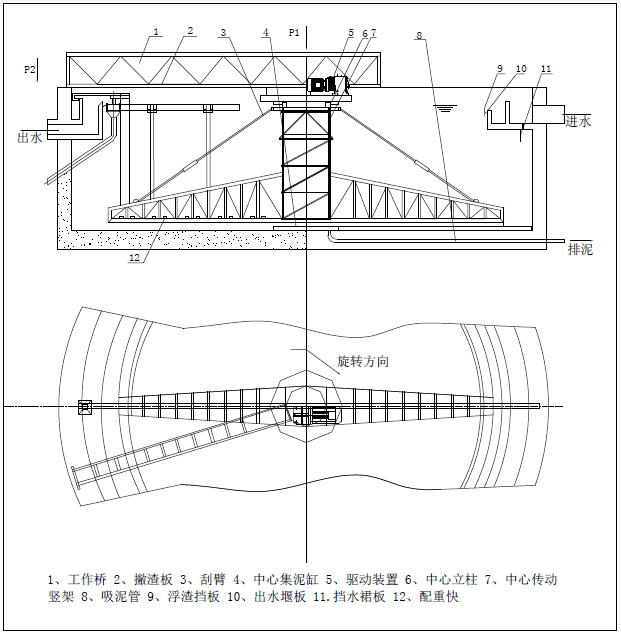 該設備采用中心傳動、垂架式,污水進入周邊配水槽內,經槽底配水孔均勻流入池內,并在周邊擋水裙板的作用下,水流從池底流向中心,污泥依靠自重沉積于池底,從而形成泥水分離,驅動裝置驅動中心豎架旋轉,并帶動刮臂及吸泥管旋轉,在靜水壓力的作用下,污泥均勻地進入吸管上布置的吸口,然后通過中心排泥井的套筒閥排出池外。排泥量的大小可由套筒閥的升降度來控制,水面的浮渣通過撇清裝置撇向池邊,再由刮渣耙刮進排渣斗內排出池外。