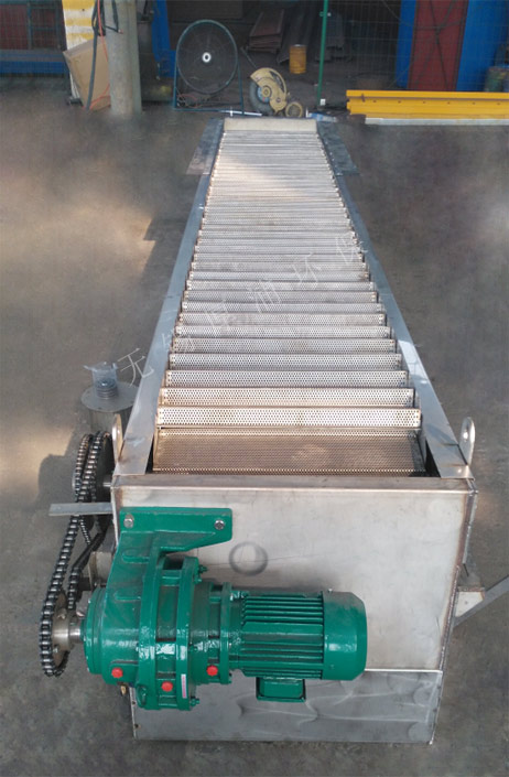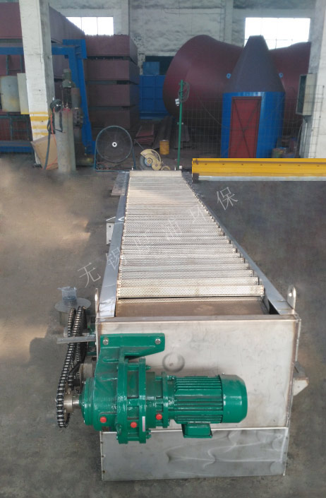 網(wǎng)板式階梯格柵機(jī)能清除漂浮物、纖維物質(zhì),運(yùn)行時(shí)不堵塞雍水,能將柵渣清除干凈。主要由驅(qū)動(dòng)裝置、機(jī)架、傳動(dòng)鏈輪、牽引鏈條、網(wǎng)板及電氣控制柜等主要部件組成。工作時(shí)網(wǎng)板在二側(cè)傳動(dòng)鏈條的帶動(dòng)下,自下而上將整個(gè)渠道寬度范圍內(nèi)的污物向上提取,抵達(dá)上部時(shí),通過(guò)鏈輪的轉(zhuǎn)向功能,自動(dòng)完成卸污工作。