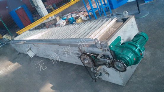 網(wǎng)板式階梯格柵機(jī)的驅(qū)動(dòng)裝置位于機(jī)架上部,除傳動(dòng)裝置外,其余均采用不銹鋼材料制造。驅(qū)動(dòng)裝置采用軸裝式減速機(jī),在機(jī)架二側(cè)設(shè)置螺旋式調(diào)節(jié)裝置,以作調(diào)整傳動(dòng)鏈條張緊用。